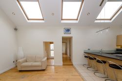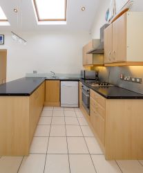 Kitchen area with tiled flooring, fitted kitchen with breakfast bar, three large sky light windows.